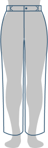 Rigid waistband sits slightly below the waist. Straight through the hip, thigh, and leg.